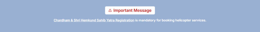 - Chardham & Shri Hemkund Sahib Yatra Registration on Uttarakhand Government Portal is mandatory to book Helicopter Service online. If not already registered, please register in advance and obtain “Yatra Registration no.” to avoid last-minute hassle. For Yatra Registration, click here: Chardham & Shri Hemkund Sahib Yatra Registration.